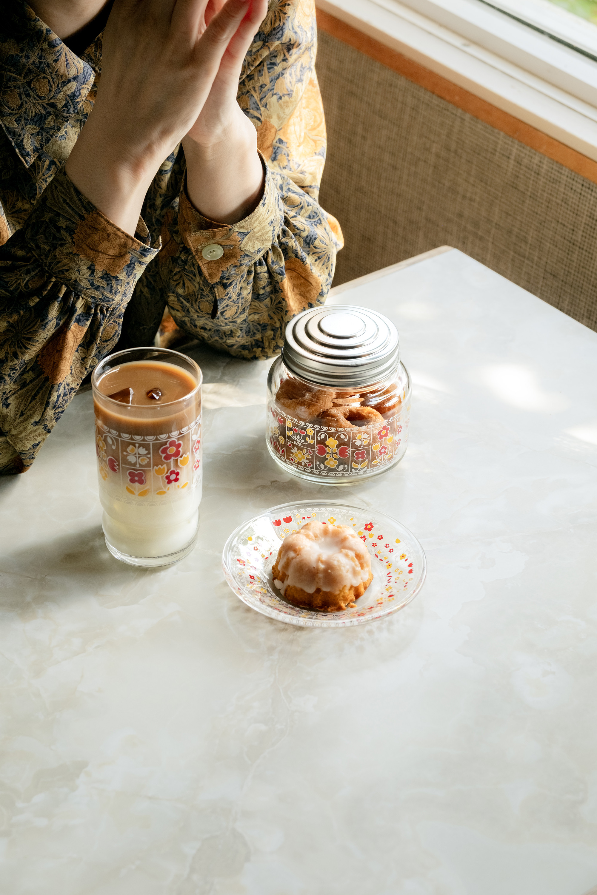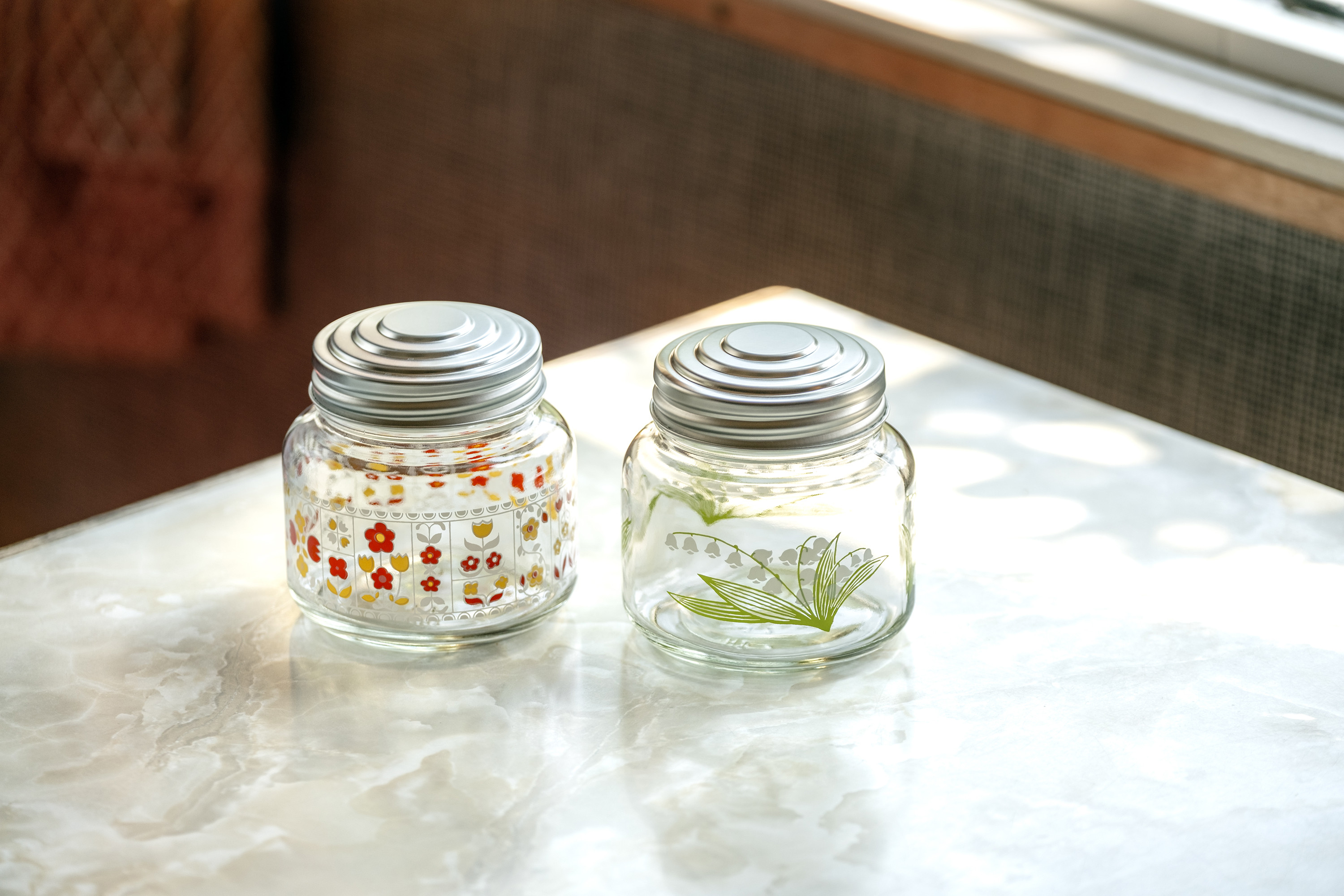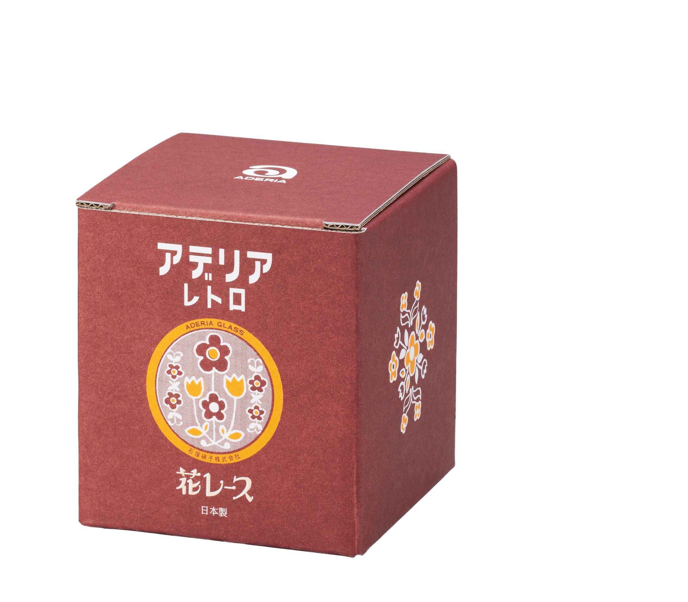 ヨーロッパの刺繍のような花模様が愛らしい「花レース」は、昭和54(1979)年に発売された柄です。昭和当時は琥珀色(アンバー)のカラーグラスにプリントされていました。「花レース」の原画は手書きで描かれたようで、ところどころに見られる線のにじみや歪みが、手仕事ならではの良い味を出しています。一つのグラスの中に様々な形の花模様が込められていて、当時のデザイナーのこだわりが感じられます。